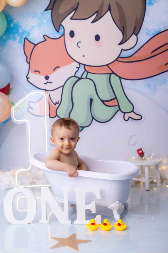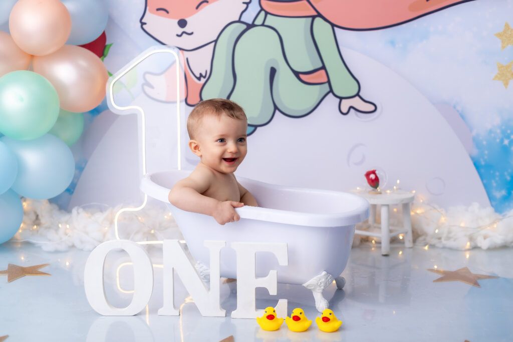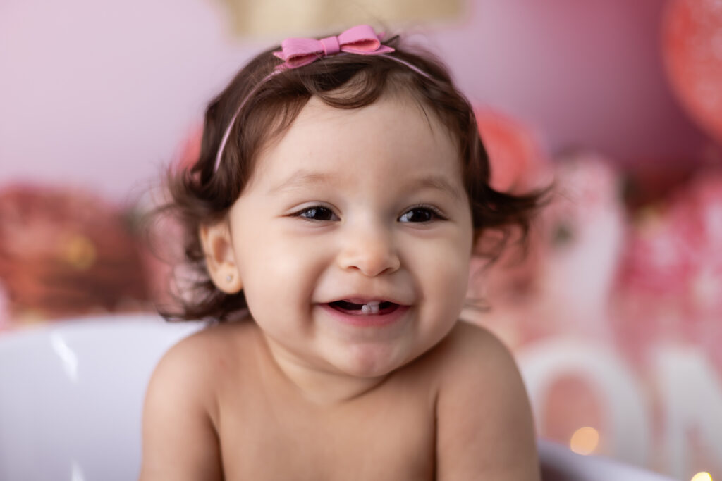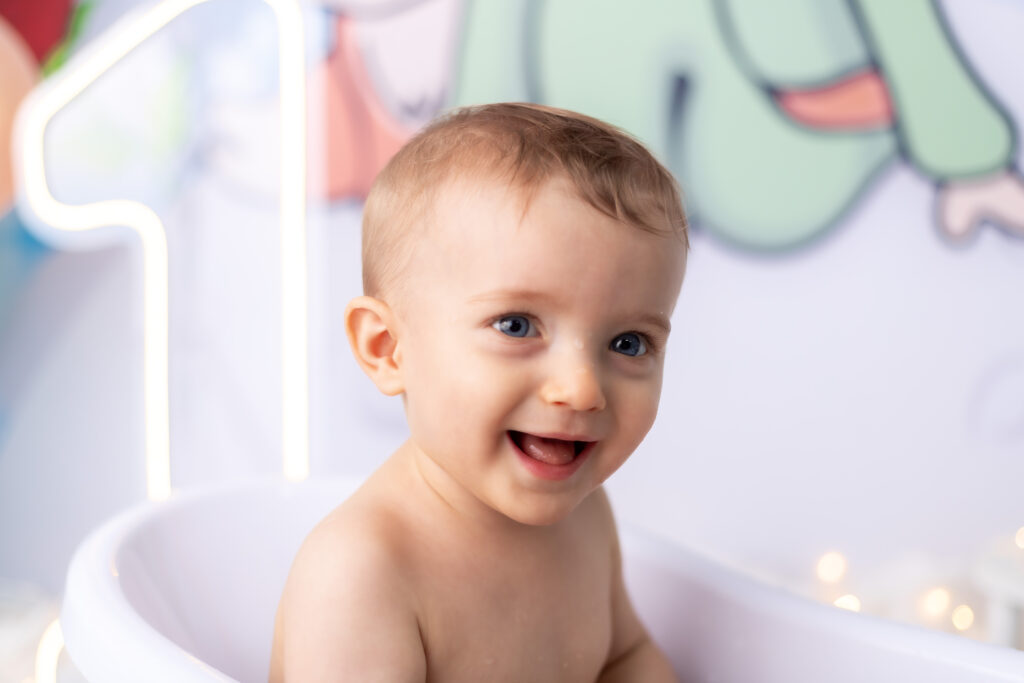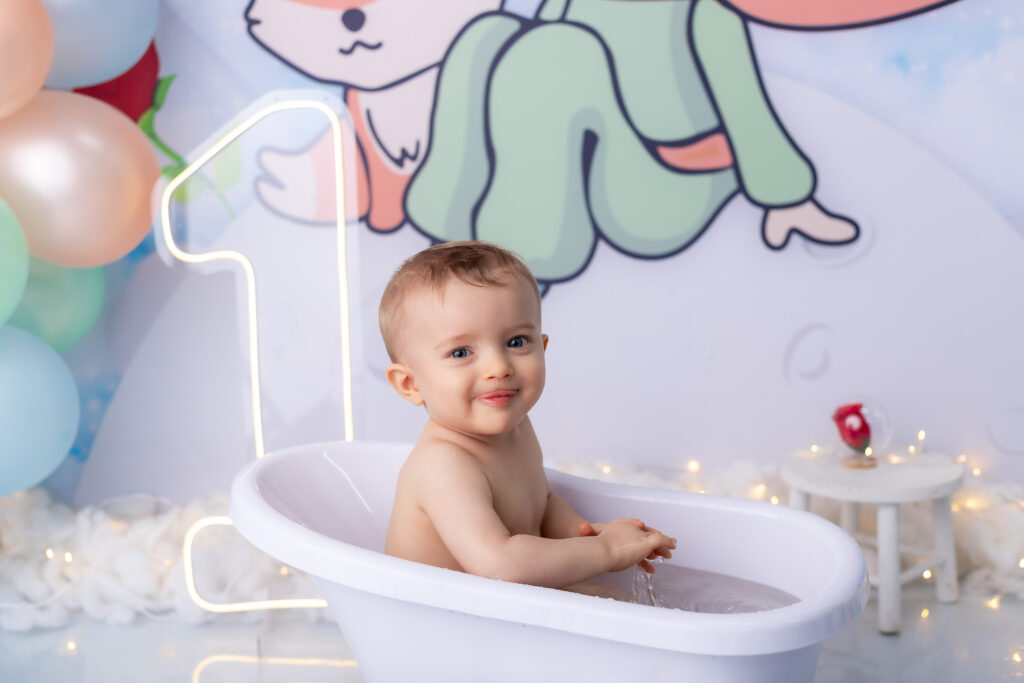 Após o bolo, preparamos um cenário delicado para um banhinho especial — com espuma suave e aquele jeitinho de diversão que rende sorrisos espontâneos e registros inesquecíveis.